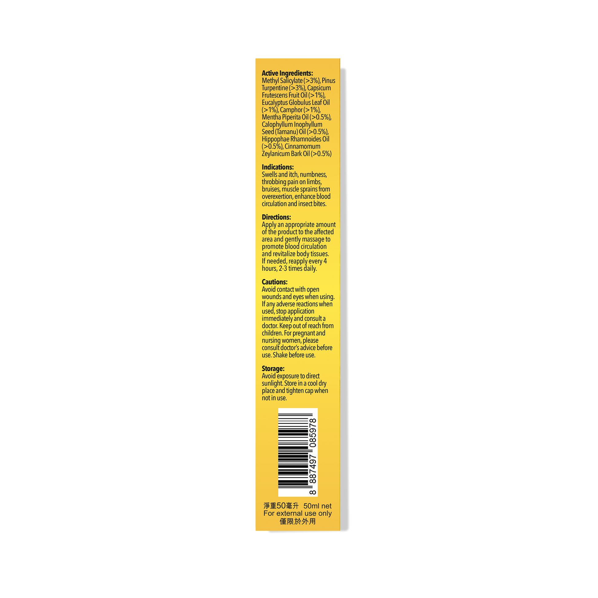 Camphor 5.00%, Dragon's Blood 1.60%, Wintergreen Oil 42.80%, Turpentine Oil 36.00%, Eucalyptus Oil 5.00%, Cinnamon Oil 0.70%, Menthol 1.00%, Capsicum Oleoresin 7.00%.