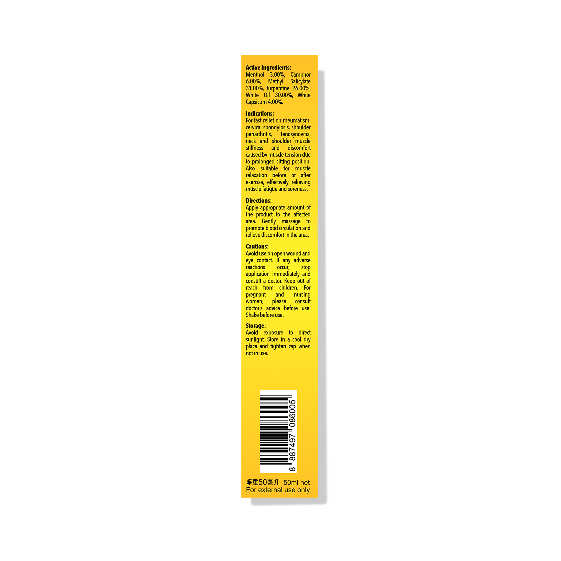 For various muscle pains caused by rheumatism, cervical spondylosis, frozen shoulder, tenosynovitis, and stiff neck. For muscle stiffness and discomfort in the shoulders and neck due to prolonged sitting. Can also be used for muscle relaxation before exercise and to effectively relieve muscle fatigue, soreness, swelling, and pain after exercise.